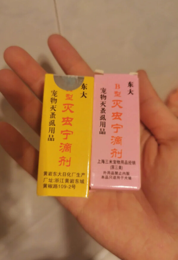 之前我家狗身上发现了很多蜱虫,甚至家里墙壁偶尔也会见到几只,持续了一两周的时间,用了这款灭虫宁驱虫药之后就再也没见到蜱虫的身影了。而且真的很平价,一支就几块钱。图一:它分为A型和B型,A型主要是驱虱子、跳蚤的,B型为加强款,可以更有效地杀死蜱虫。用法:拨开宠物脊背上的毛发,将滴剂滴在宠物的皮肤上,避免宠物舔食。用量:根据宠物体重,10公斤的用一瓶,5公斤用半瓶,2.5公斤用三分之一瓶,小猫用五分之一瓶。(因为家里三只现在基本上没有虫子,预防中毒我有减量,我家狗狗18斤就用半瓶,两只猫都是八九斤各用四分之一瓶,三只一次刚好用完一瓶。)优点:便宜,见效快。缺点:味道较刺鼻,毒性较大(尽量减量使用(减半),并防止宠物自舔及互舔),好像拼多多上现在卖的都是假货,这个已经买不到了。图二:买不到东大的AB型驱虫药,就买华畜的非泼罗尼,效果是一样的,都是大厂正规生产,质量和药效有保证。甚至大家还可以逛逛华畜的旗舰店,里面都是宠物平价平替药,很多宠物医院都是用的华畜品牌。